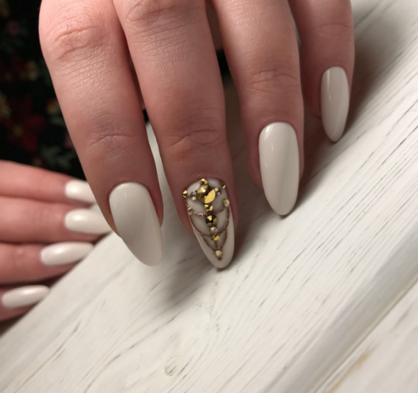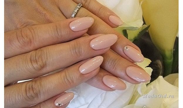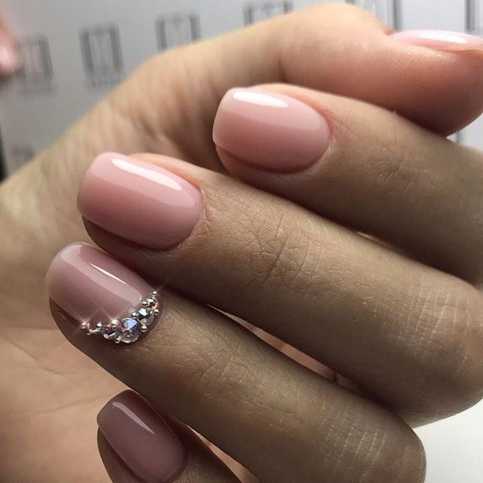 Идеальный маникюр для свадьбы должен быть выполнен в пастельных или нюдовых тонах. Но никто не запрещает использовать различные декоративные элементы, способные украсить общую картину и придать ей праздничный облик. Если для повседневного образа стразы могут показаться слишком вычурными, то в случае свадебного маникюра, они преркасно впишутся в общую картину. При желании можно разбавить такой маникюр блестками