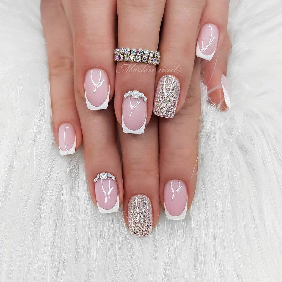 Классический французский маникюр с квадратной формой ногтя. Чтобы немного разнообразить его добавьте немного мерцания и блесток для ногтей. Этот маникюр использует белый блеск на кончиках, а также акцентированный ноготь на каждой руке.