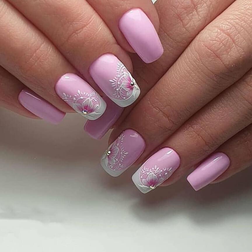 Розовый оттенок в свадебном маникюре 2024-2025 может быть в качестве основы или использоваться для рисунка на ногтях. Однотонный розовый маникюр невесты или милые и нежные цветочки очень красиво смотрятся на свадебном маникюре.