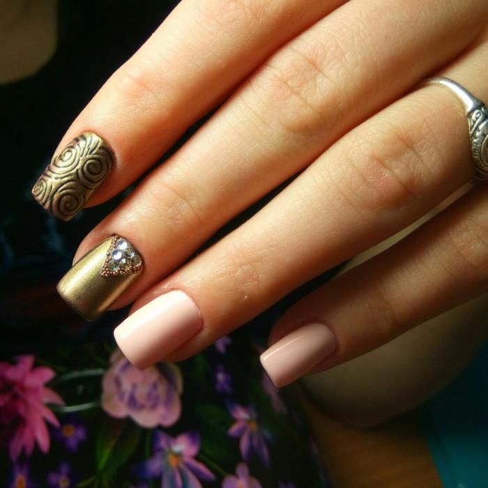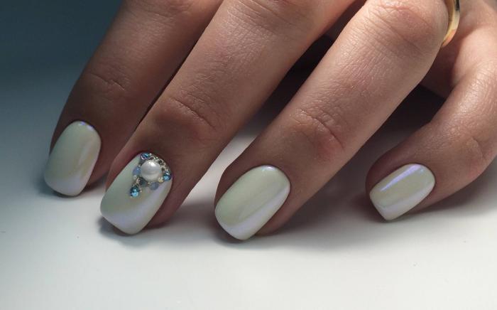2. Имитацию материалов. В основном, в качестве украшений невесте служат ювелирные украшения из золота, платины, серебра, жемчуга или бриллиантов. В маникюре прекрасными аналогами данных материалов выступают золотой и серебряный песок, блестки, стразы, перламутровый лак. С ними Ваш образ станет бесподобным!