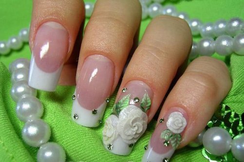 Очень часто ногти расписываются цветочками. Поскольку в день свадьбы у невесты всегда в руках цветы, то «цветочные» ноготки также довольно уместны. Причем можно изобразить на ногтях обычнее цветы или же собранные в небольшие букеты. Просто восхитительно выглядят цветы, чьи лепестки сделаны при помощи акриловой художественной лепки.