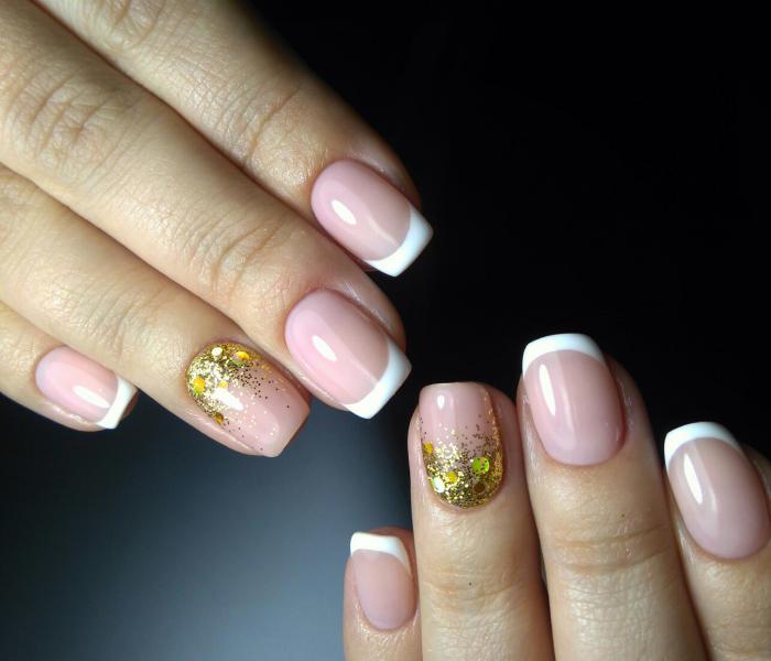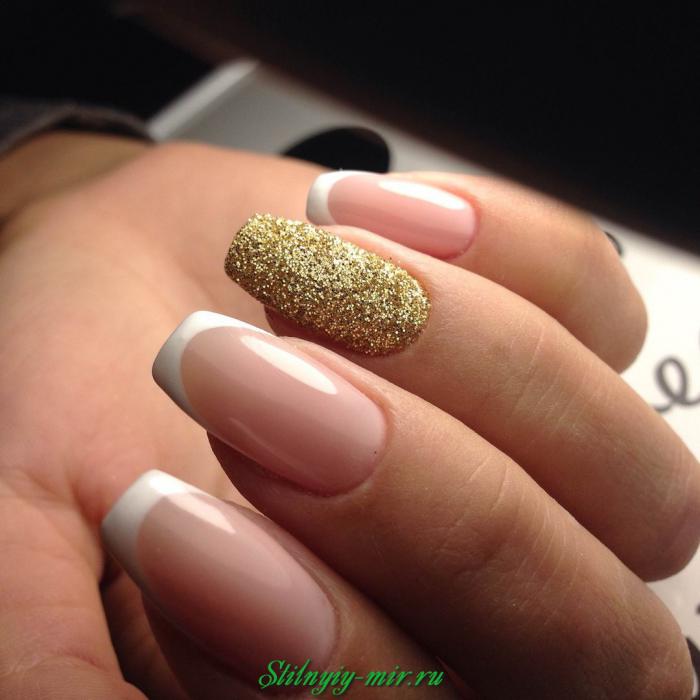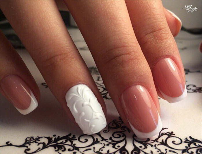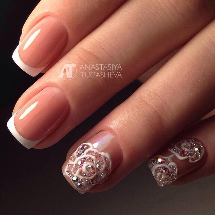 Французский маникюр станет идеальным решением для юных девушек, а также тех, кто предпочитает следовать классическим традициям и выбирает белоснежное романтичное платье. Такой вид маникюра подразумевает окрашивание ногтевой пластины в два цвета. Основание ногтя окрашивается в пастельный розовый или бежевый цвет, а его окончание – в белый. Желая придать ногтям праздничность, кончик ногтя можно украсить стразами или тонким кружевом.
