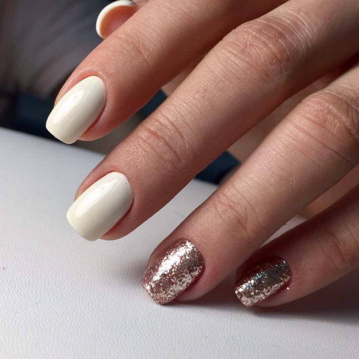 Стоит быть осторожной с глиттером — маникюр на свадьбу невесте с использованием блесток выглядит очень эффектно, но важно гармонично сочетать его с платьем. Если у твоего наряда теплый подтон — выбирай золотой глиттер, если холодный — серебряный