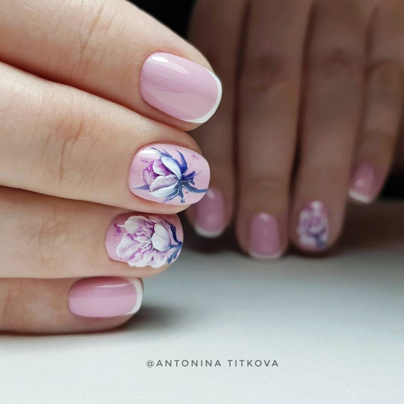 Для дизайна используйте светлые классические оттенки: розовый, серый, прозрачный, кремовый и другие. Френч великолепно смотрится и с темными тонами: черным, фиолетовым, синим, бордовым. При этом нужно ограничиться только выделением края ногтя глиттером, от сухих блесток лучше отказаться.