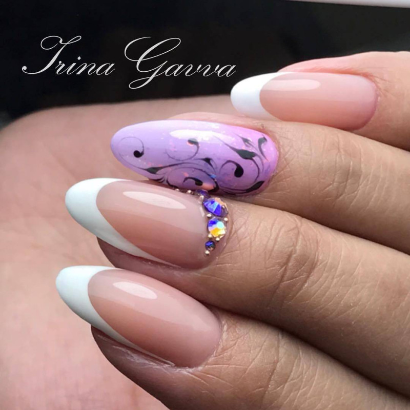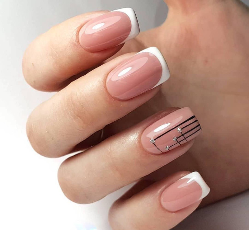 - Классический френч. Сочетание естественных оттенков и белого лака смотрится элегантно и неброско. Разнообразить классику можно незатейливыми узорами, например, кружевными завитками, или стразами. Рисунок достаточно сделать на одном пальце или чередовать;