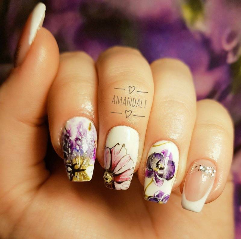 Рисунки и принт на ногтях выглядят креативно. Это тот вариант, где можно дать волю фантазии, проявить индивидуальность. Изобразить можно всё, что угодно: от полосок и геометрических фигур до цветочков и звёздочек. Исключение составляют рисунки, несущие негативный смысл (черепа, кресты)