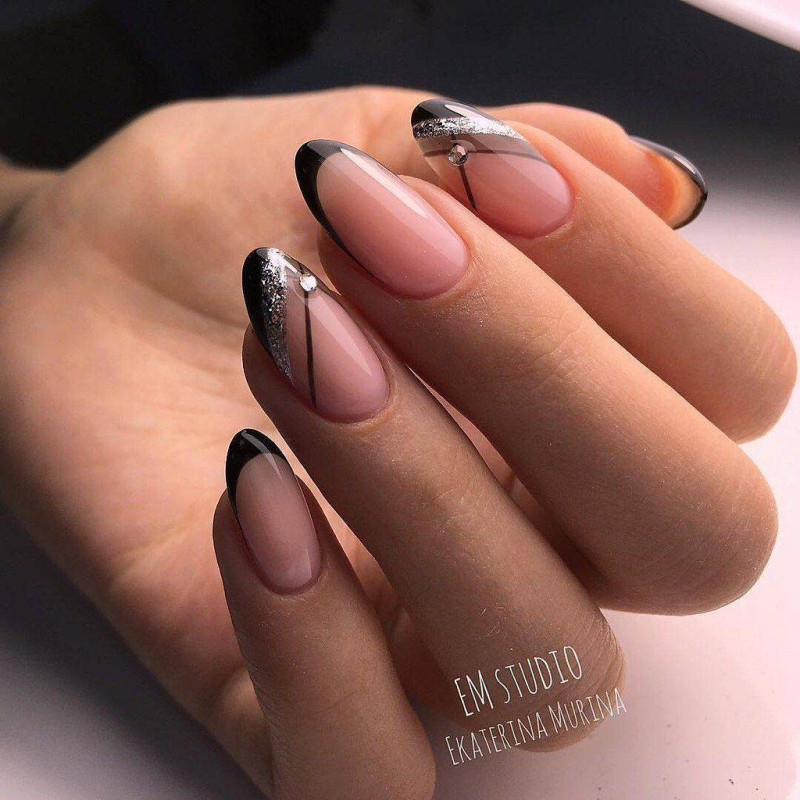 Что такое лунный маникюр? Это французский дизайн “наоборот”. Полоска, которая отличается по цвету, располагается в районе ногтевой лунки. Она может быть прозрачная, более темная, выполненная из блесток или украшенная камнями. Маникюр можно сделать более эффектным, если подчеркнуть линию разделения двух тонов контрастным рисунком или стразами.