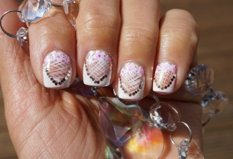 Выполняется аналогично предыдущему варианту. Только вместо кружева на ногти приклеивают стразы специальным клеем. Если его нет, то можно покрыть ногти несколькими соями лака и пока он не высох погрузить туда стразы. Для этого маникюра используются специальные стразы, которые имеют ровную поверхность, покрытую специальным клеем, отчего прочно закрепляются на ногтях. Брать стразы следует не руками, а пинцетом или смоченной зубочисткой.