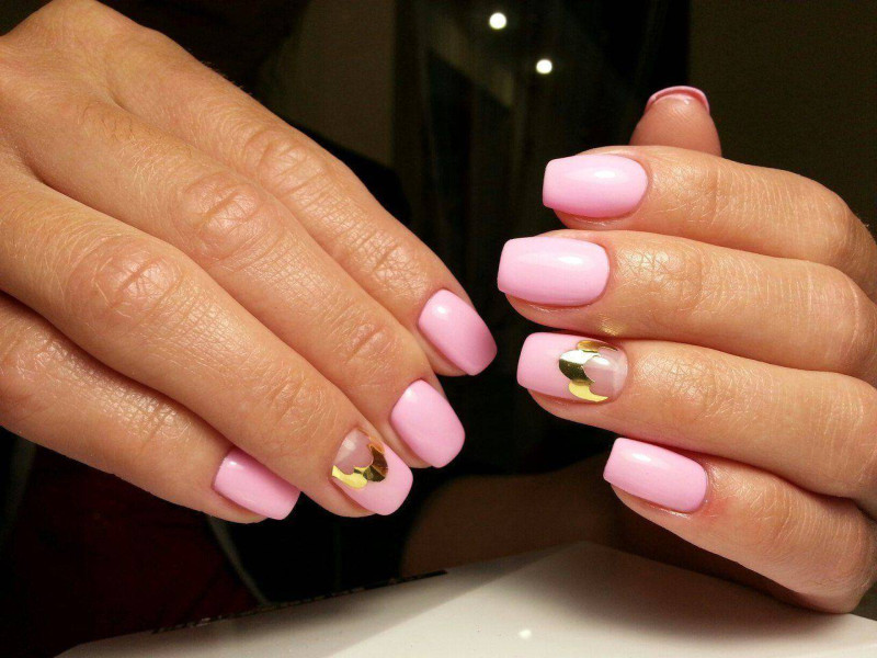 - Перламутровые лаки светлых оттенков и акцент с помощью камешков или страз на безымянном пальце. Все ногти покрываются лаком одного тона, а на ноготь безымянного пальца поверх лака наносится тонкий слой из украшений;