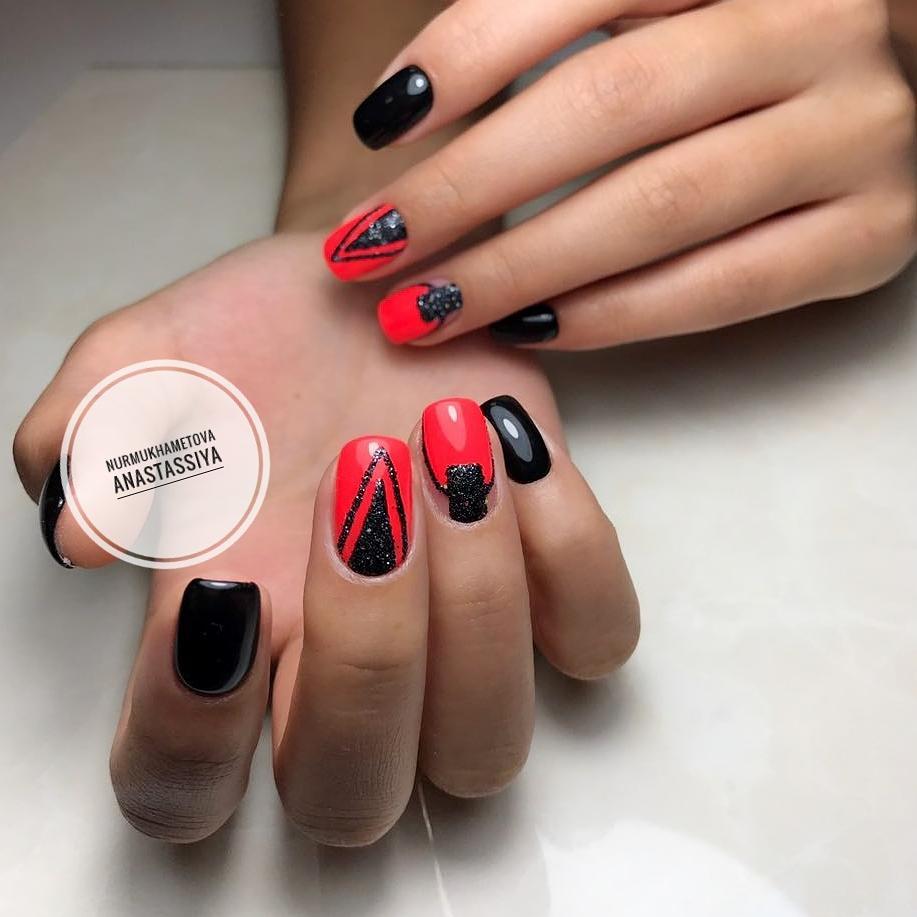 - Острые ноготки скроют полноватые пальчики – для них предусмотрен контрастный дизайн, например, чёрный и белый, зелёный и красный, с украшениями из блесток и страз.