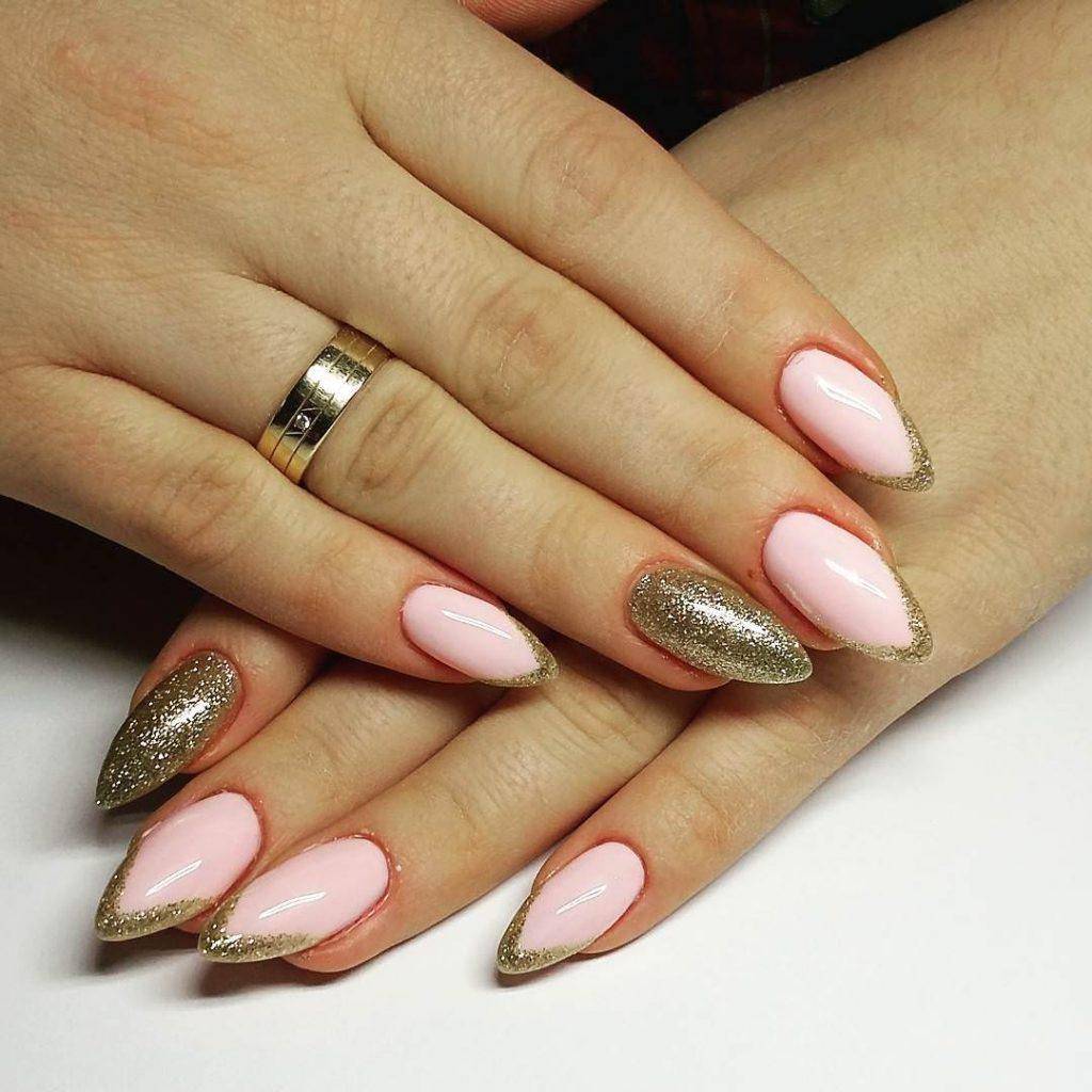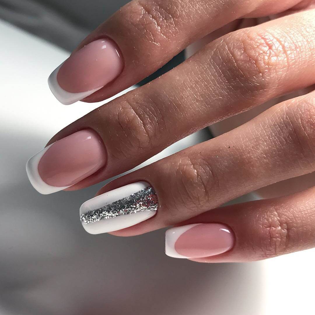 Россыпь сухих блесток уже не актуальна, выглядит просто и банально. Используйте гель-лаки с золотым или серебряным глиттером для выделения «улыбки» френча. При желании можно украсить сухими блестками прикорневую зону.