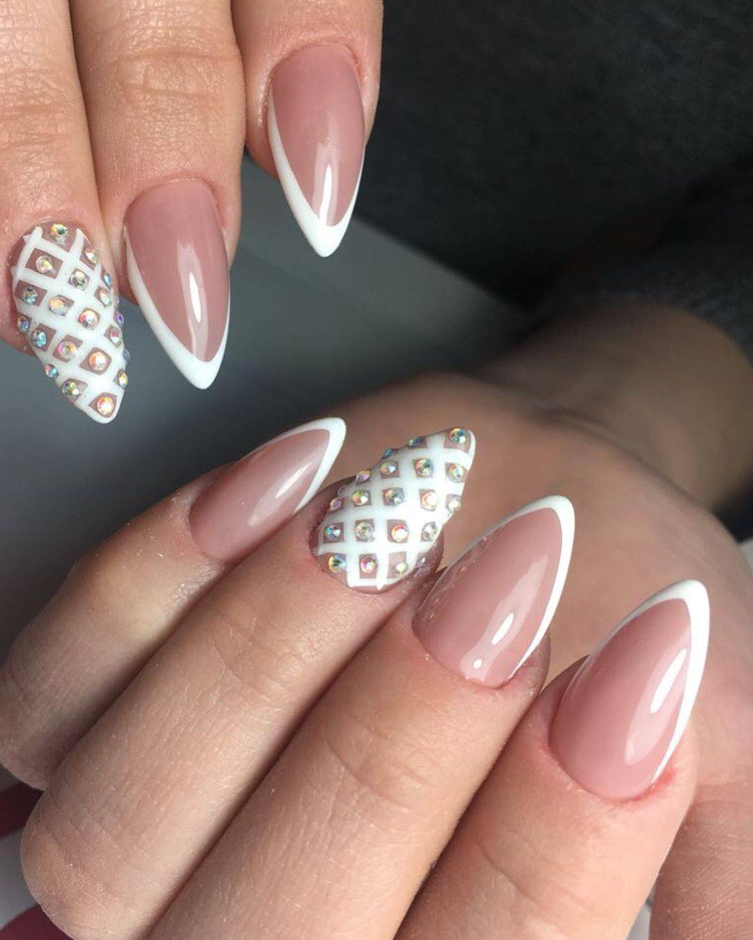 - Чередование розового нюд и белого цвета. Матовый розовый чередуется с белым лаком, поверх которого нанесены продольные серебристые полоски, украшенные внутри аккуратными камешками;