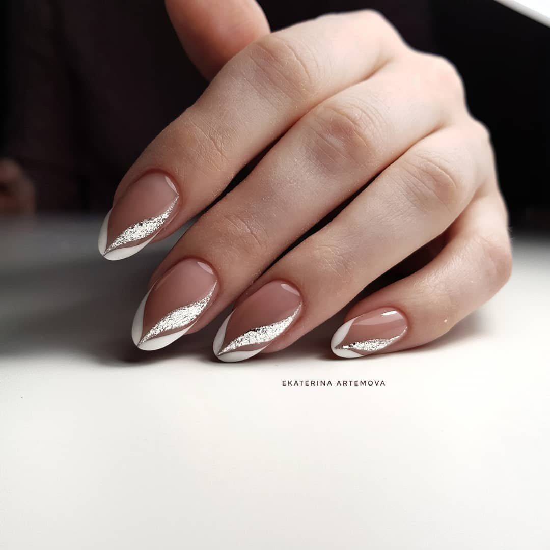 - Белый и серебристый с рисунком. Ногти могут быть покрашены не монотонно. Например, два пальца оформлены в бело-серебристой гамме, а остальные лишь белым цветом. Ногтевая пластина делится лаком пополам, на серебристую часть накладываются кружевные узоры белого цвета. На безымянном пальце серебром уместно выделить лунулу, украсив её дугой с небольшим камешком;