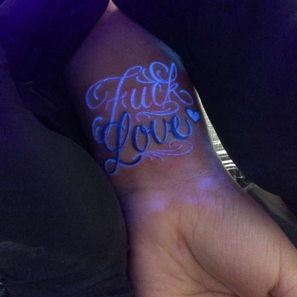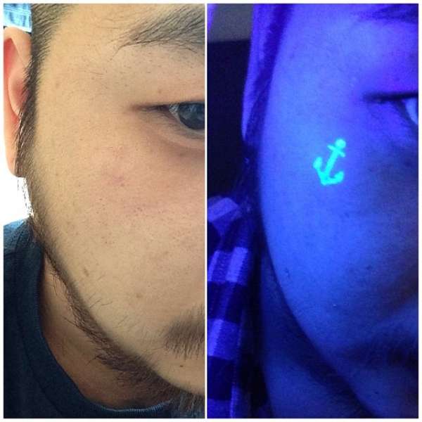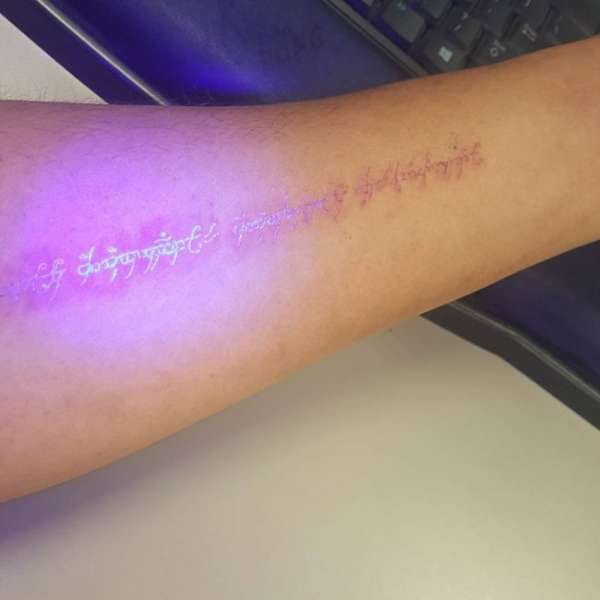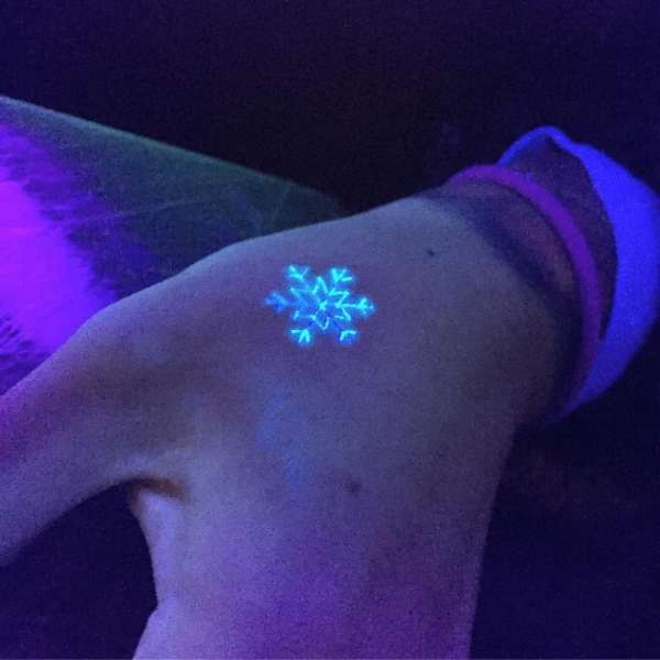 «На первый взгляд ультрафиолетовая татуировка особо не отличается от обычной — она светится только при УФ-освещении. Вот так это выглядит. При дневном свете не видно только белый пигмент, который под ультрафиолетом становится голубым.