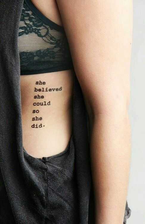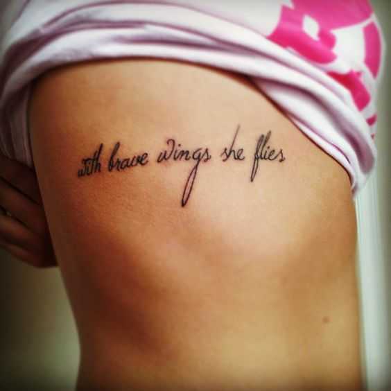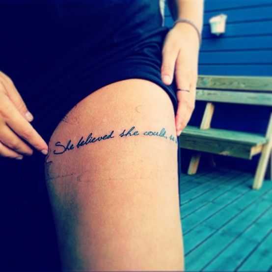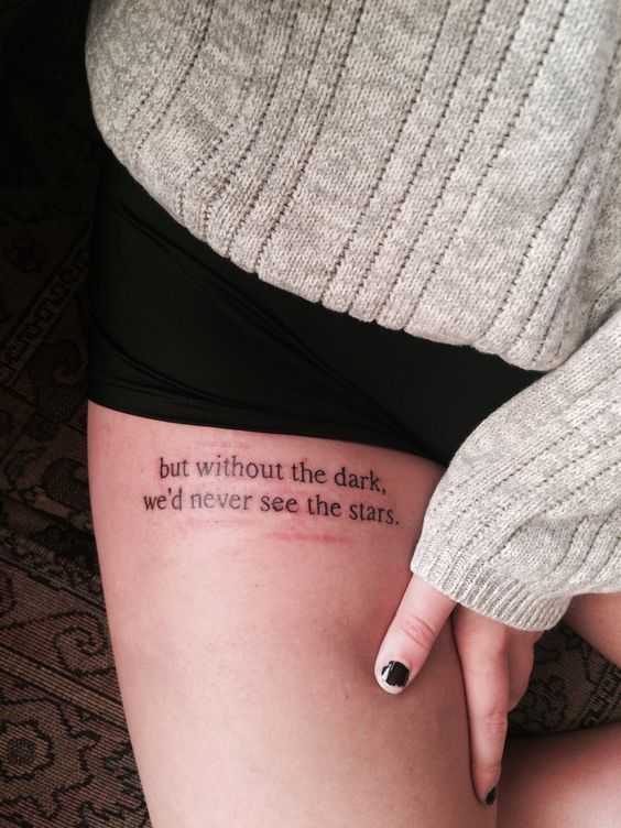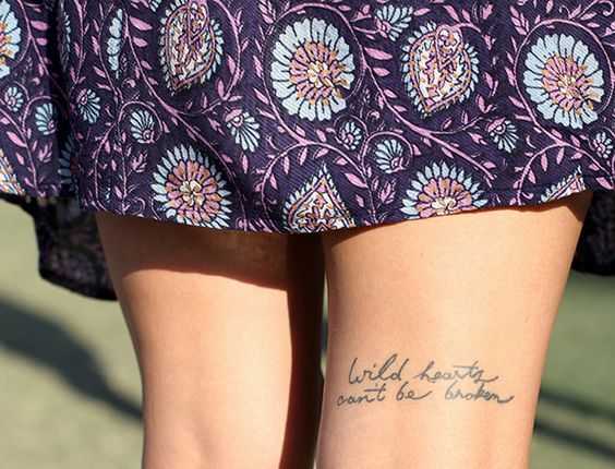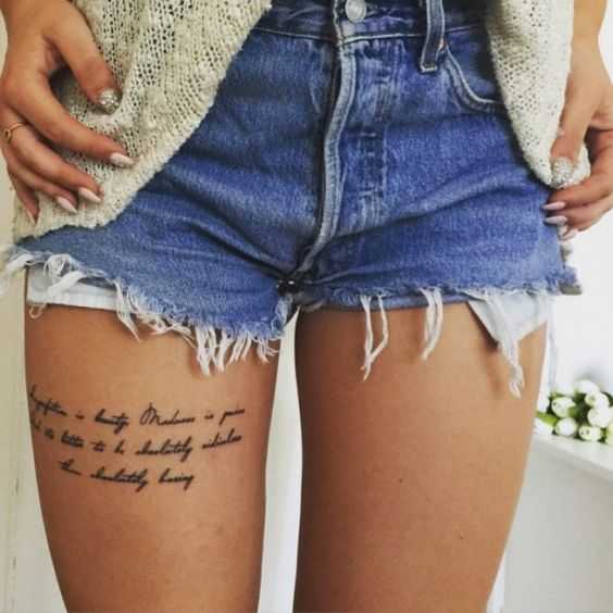 Одна из самых популярных зон для нанесения тату надписи у девушек – это бедро. Его размеры позволяют нанести довольно большой текст, поэтому некоторые даже выбирают целые стихотворения. К тому же, если правильно разместить надпись, то можно подчеркнуть красивую линию изгиба бедра.