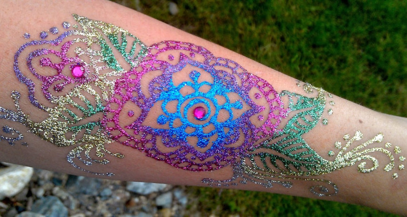 Глиттер тату – это яркое, эффектное, солнечное и красочное решение, способное приятно удивить, как зимой, так и летом. Например, менди-тату хной создаются в теплой однотонной гамме, ультрафиолетовым краскам присущи холодные оттенки, а вот у татуировки блестками этих ограничений нет, поэтому они являются идеальным решением.