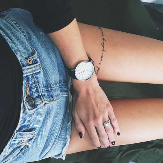 Пожалуй, самым популярным местом для тату в виде надписи можно назвать именно плечи и руки. К примеру, на плече довольно часто делают крупные надписи или же с большим количеством слов. Фактически на этой зоне можно разместить тату любого шрифта и размера.