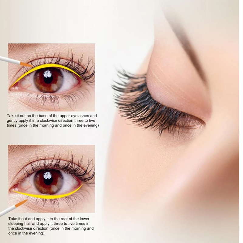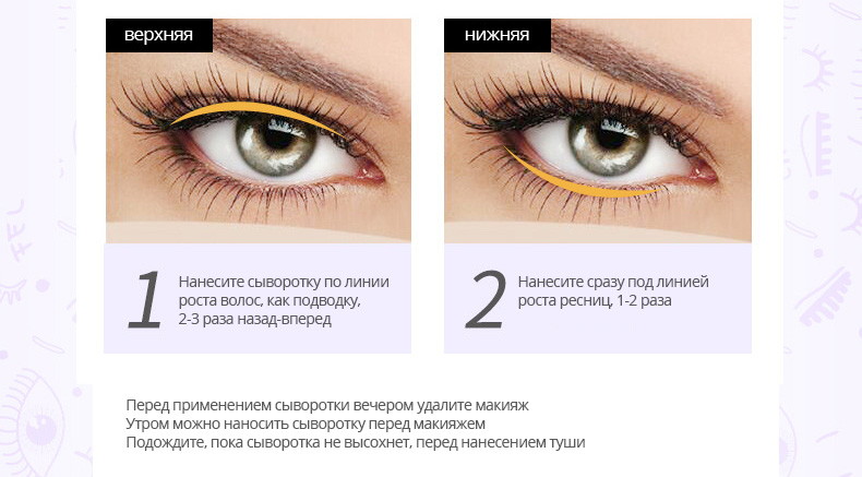 Наносить средство рекомендуется 2 раза в день, на веко вдоль роста ресниц либо на брови. При этом после высыхания сыворотки, не запрещается делать макияж. Флакон объемом 7 мл укомплектован тонкой кисточкой, которой удобно наносить сыворотку, но некоторые пользователи отмечают ее недостаточную длину.