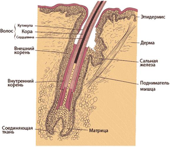 Волос состоит из двух частей. Видимая – стержень волоса, а скрытая в коже – фолликул. Живая часть волоса – только в фолликуле, расположенном глубоко в дерме.