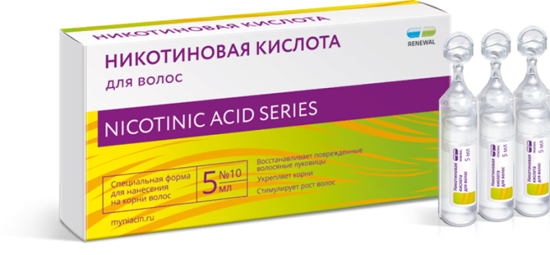 Как мы упоминали вначале, правильное питание – это лишь один из нескольких факторов здоровья и красоты локонов. Если изменение рациона никак не отразилось на внешнем виде шевелюры, необходимо «пройтись» по другим распространенным причинам мужской алопеции. В некоторых случаях не обойтись без профессиональной врачебной помощи. Поэтому, заметив неутешительную динамику, лучше как можно быстрее обратиться к трихологу. Специалист проведет консультацию, возможно, отправит вас сдать некоторые анализы. На основании полученной информации трихолог составляет программу лечения, назначает подходящие средства. К примеру, репутацию отличного помощника в борьбе с выпадением волос успела заслужить никотиновая кислота, которую, кстати, также называют витамином В3, или витамином РР. Косметическое средство, наносимое на кожу головы, восстанавливает и активизирует волосяные луковицы, усиливает микроциркуляцию в клетках, улучшает транспорт кислорода и питательных веществ, укрепляет корни и способствует выработке меланина. Как следствие, ускоряется рост новых волос, приостанавливается выпадение. Локоны приобретают густоту и силу, выглядят здоровыми и крепкими.