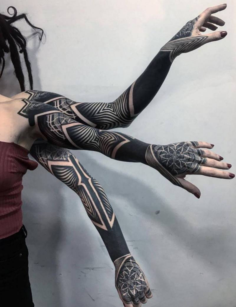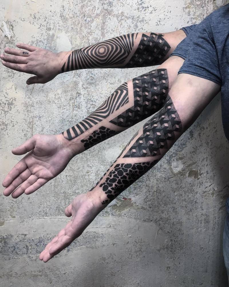 - Полностью закрашенный однотонный браслет с грубыми брутальными линиями в стиле блэкворк;
