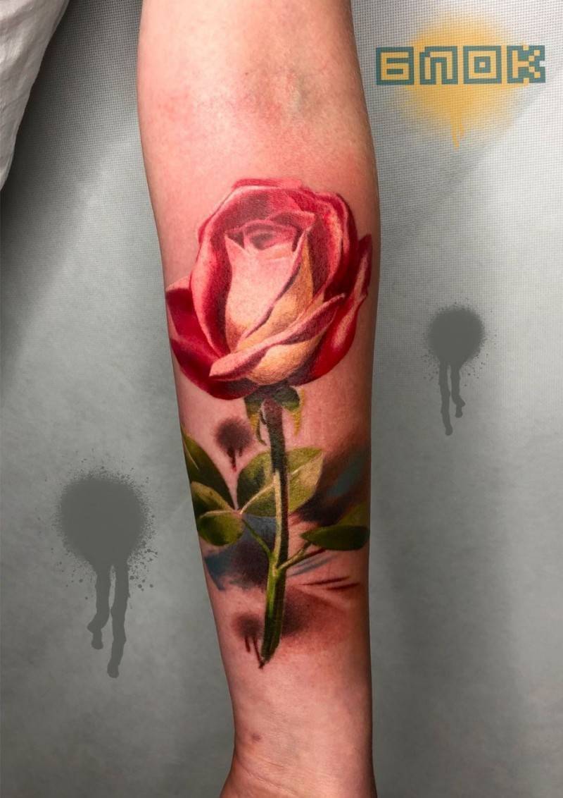 Цветы. Это может быть и стилизованный цветочный орнамент, и реалистичные изображения растений, собранных в венок. Особенно красиво такие татуировки смотрятся в цвете, от монохромных вариантов лучше отказаться, в данном случае они слишком схематичны, не отражают в полной мере внешнюю привлекательность. Цветы могут быть совершенно разными, браслет выполняется и с розами, и с ромашками, и с тюльпанами, и с другими растениями. Они придают образу хозяйке женственности, подчеркивают ее духовность, внутреннюю и телесную чистоту.