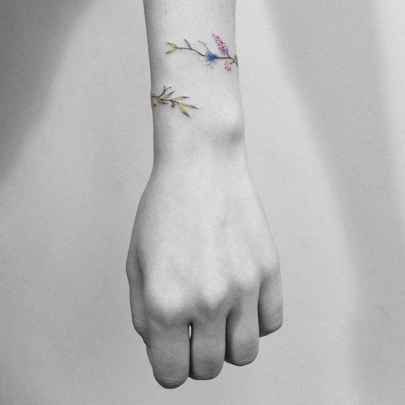 Не менее привлекательным и оригинальным решением для татуировки на руке можно назвать различные эскизы в виде браслета. В древности подобные нательные рисунки обеспечивали своему владельцу защиту высших сил. Сегодня отношение к тату браслетам немного изменилось, но в целом рисунки такого характера продолжают считаться оберегами, ведь, как известно, замкнутая в круг линия является могущественным защитным символом. Также следует отметить, что татуировка в виде браслета может выполнять роль ненавязчивого и симпатичного украшения и не иметь каких-то определённых трактовок. Для нанесения тату браслета используются всевозможные растительные узоры, в которые вплетены цветы, а также различные геометрические фигуры, элементы, имитирующие металлические детали, тонкие линии и орнаменты. При этом мужские татуировки отличаются чёткостью линий и некой брутальностью, а для женских эскизов характерны более утончённые вариации рисунков.