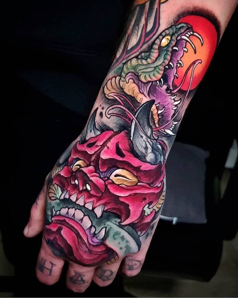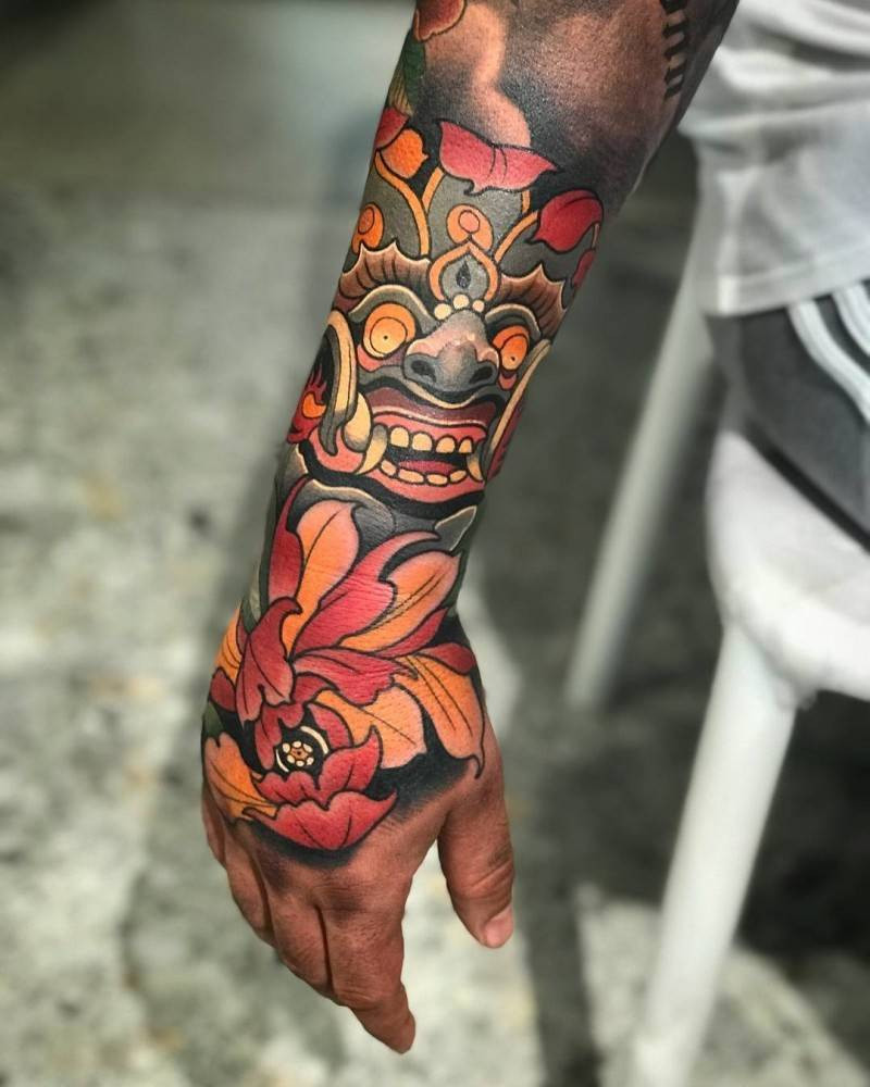 Японский стиль. Если хочется дополнить образ яркими и максимально выразительными красками, целесообразно присмотреться к этому смелому стилю. Самая главная отличительная черта этого направления заключается в исключительном символизме. Тату в виде браслета на руке в японском стиле будет демонстрировать яркие краски, пестрые и сложные рисунки.