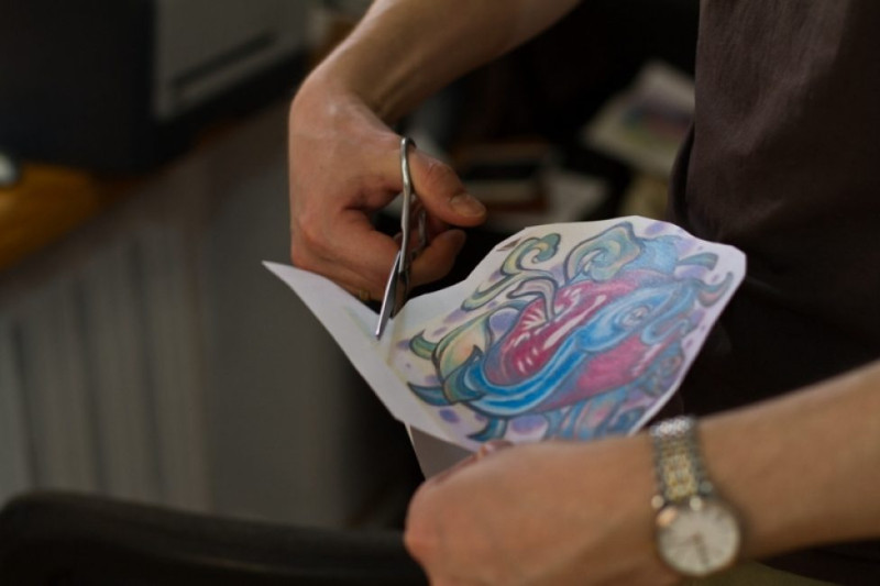 Рисунок прикладывают к коже, прижимают полотенцем и аккуратно снимают так, чтобы получился эффект «переснимачки», как в детстве. Эскиз остается на коже.