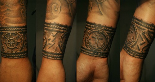 Мужские тату на запястье на руку очень часто оказываются широкими, выполненными обычно в одном цвете, выражено символичными. Рисунок или узор легко читается и быстро запоминается. Орнамент, чаще всего, поддается расшифровке и включает понятия: