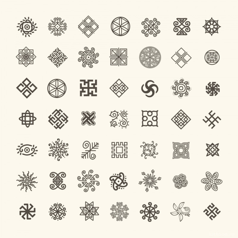 Узор, изображающий лиственное дерево, обозначал жизненную силу. Татуировки с изображением триединого начала: солнца, огня и воды, были символом защиты природными силами. Чтобы показать невероятную мощь, воины делали себе татуировки тигров, львов, драконов. Символом любви, счастья и гармонии считался знак Ладинец. Ярило олицетворял бога солнца и плодородия.