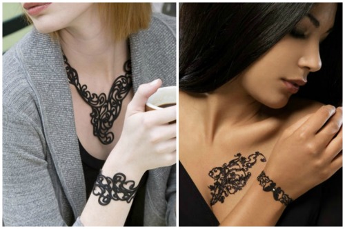Имитация украшений. Почти все девушки без ума от ювелирных изделий и бижутерии. Эти предметы добавляют образу индивидуальности, делают его более благородным и элегантным. Татуировка – это превосходная альтернатива покупке украшения в ювелирном магазине! Выглядит она очень стильно, при этом, она всегда остается с хозяйкой, не может потеряться или сломаться. Такие орнаменты довольно часто выполняются в реалистичном стиле, мастера в точности подбирают оттенки, характерные для благородных металлов или драгоценных камней, прорабатывают блики и блеск, даже имитируют раскачивание элементов браслета, возникающее во время ходьбы