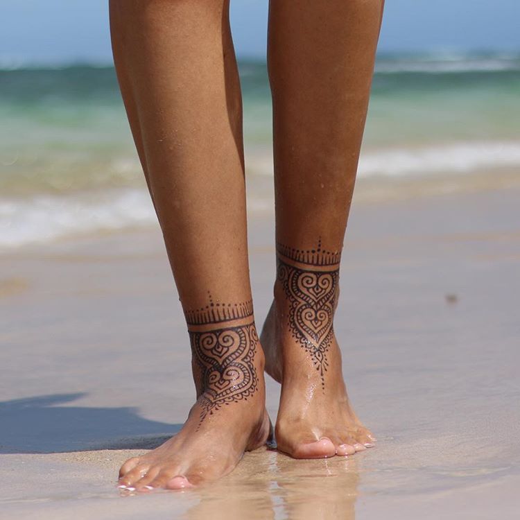 Цепочки и бусы. Кольца, подвески, перья – любые этнические и оригинальные декоративные элементы легко вписать в тату браслет на ноге;