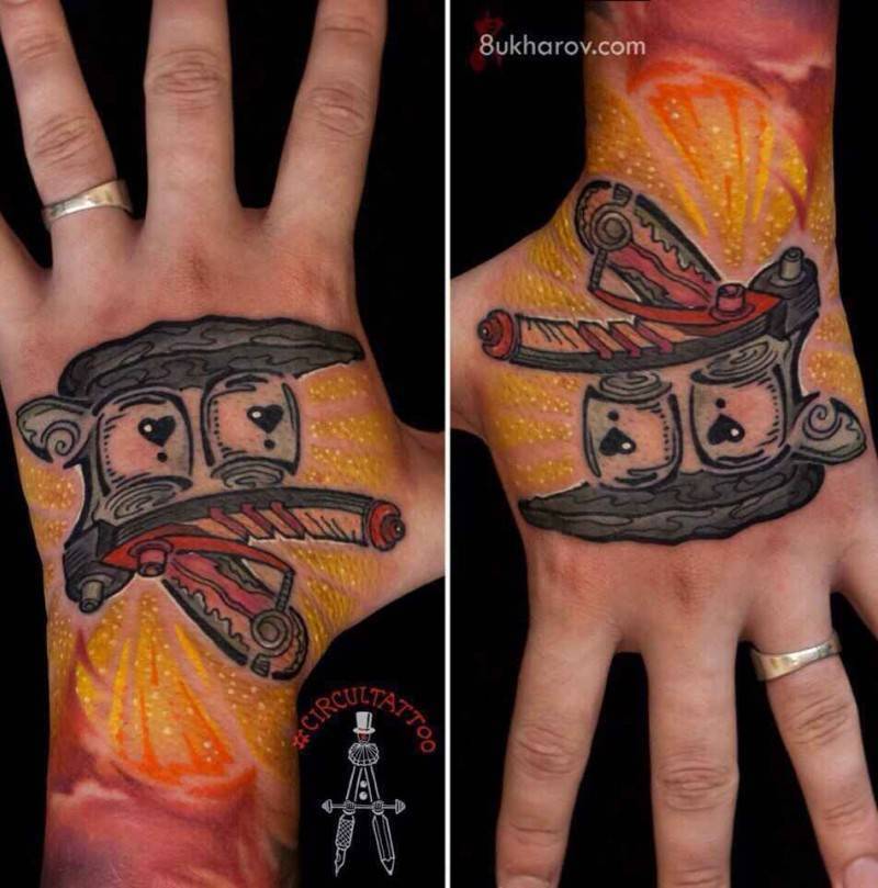 Наколка в виде строительного инструмента рассказывает об интересах или профессиональной направленности обладателя.