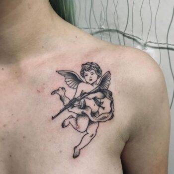 Не менее популярно изображение ангела или ангелочка, держащего в руках автомат, преимущественно российского производства АК-47.