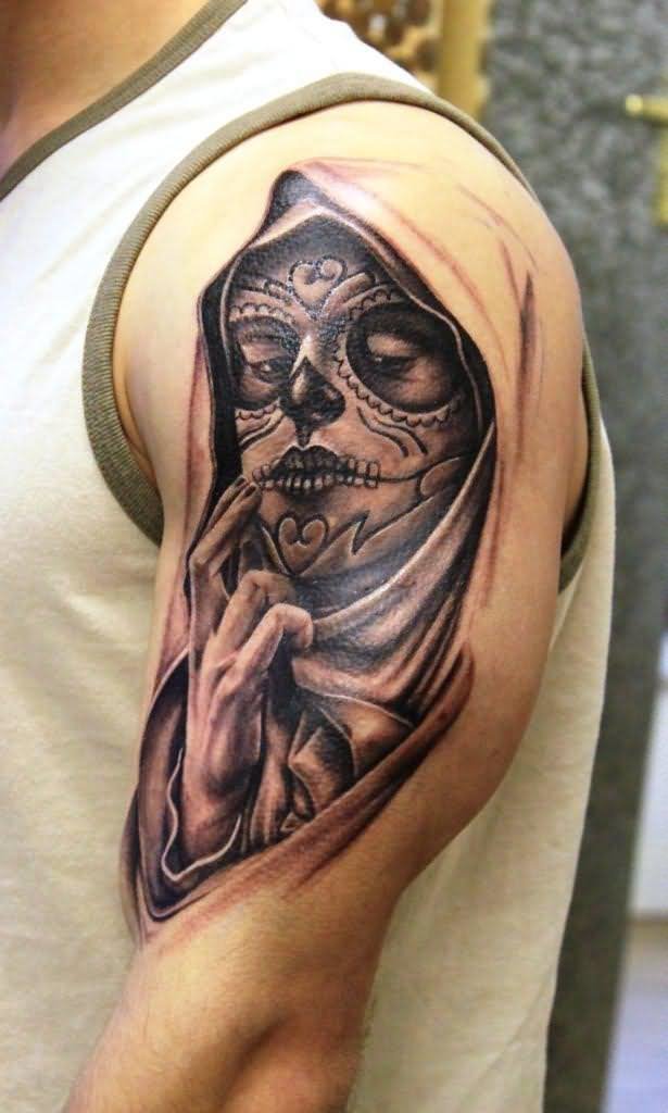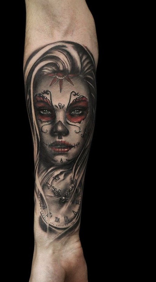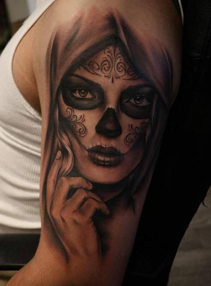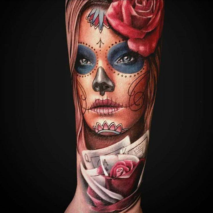 Чаще всего изображают красивых девушек, черепа либо девушек с элементами смерти. Это все для полной картины украшается цветами, узорами, шрифтами с различными объемными деталями.