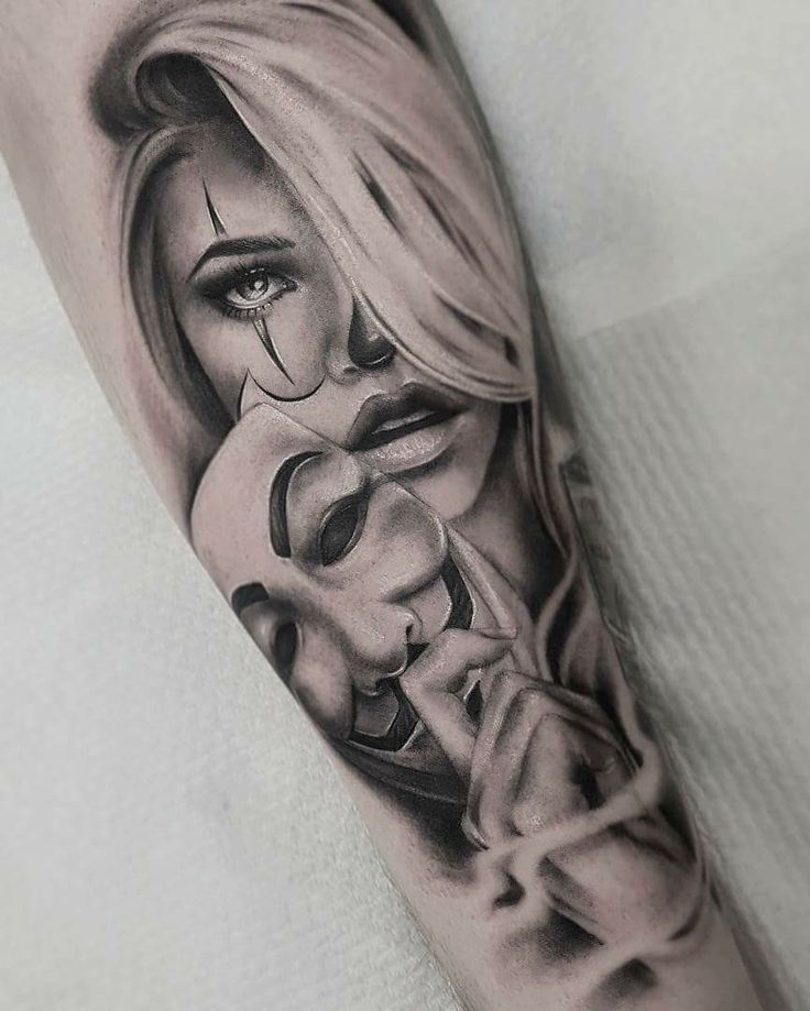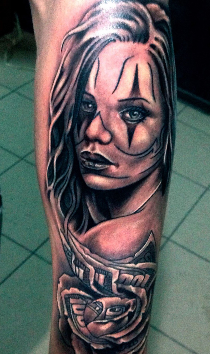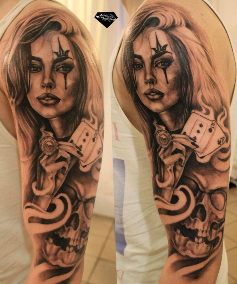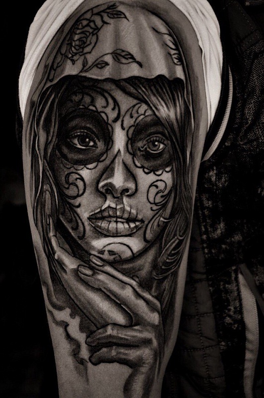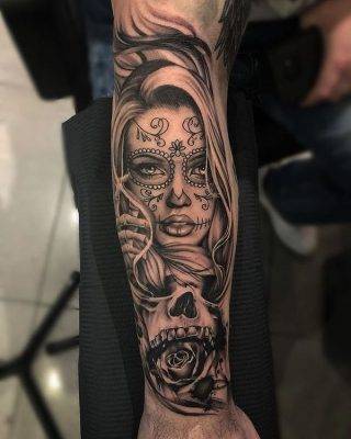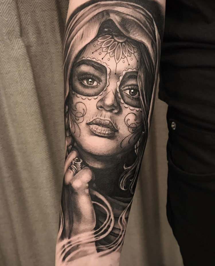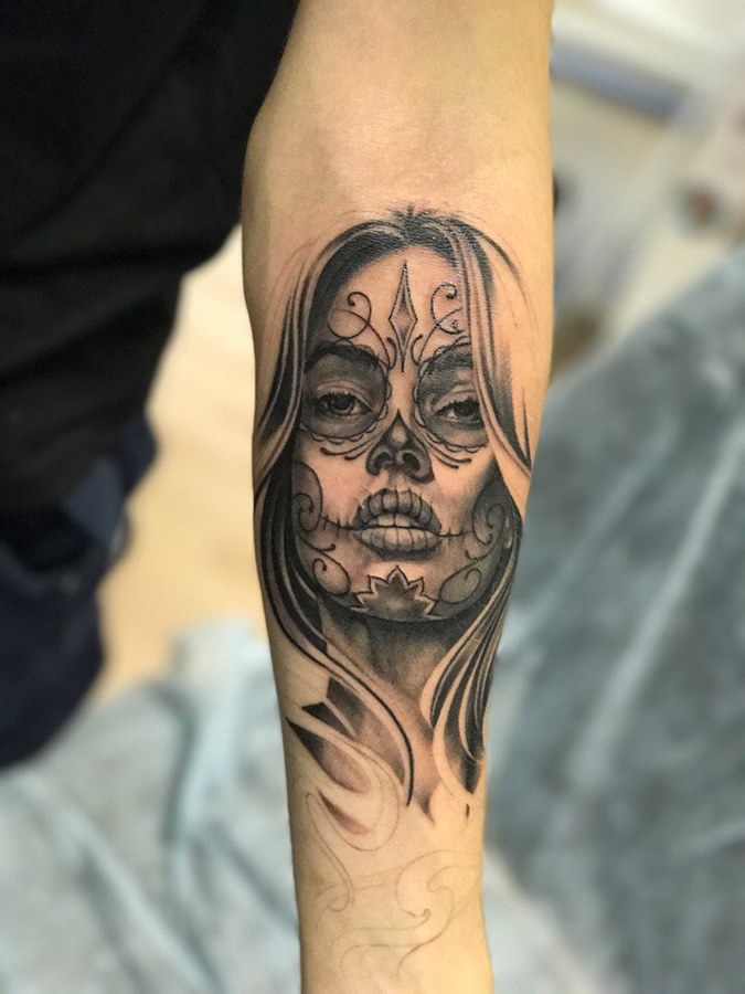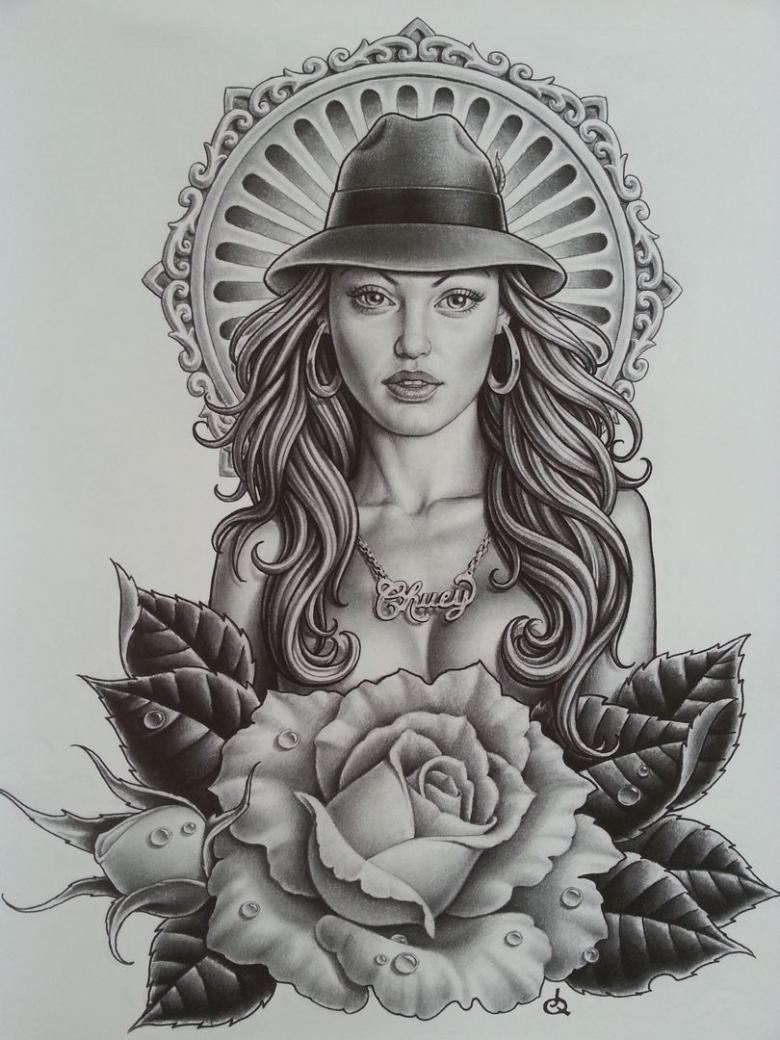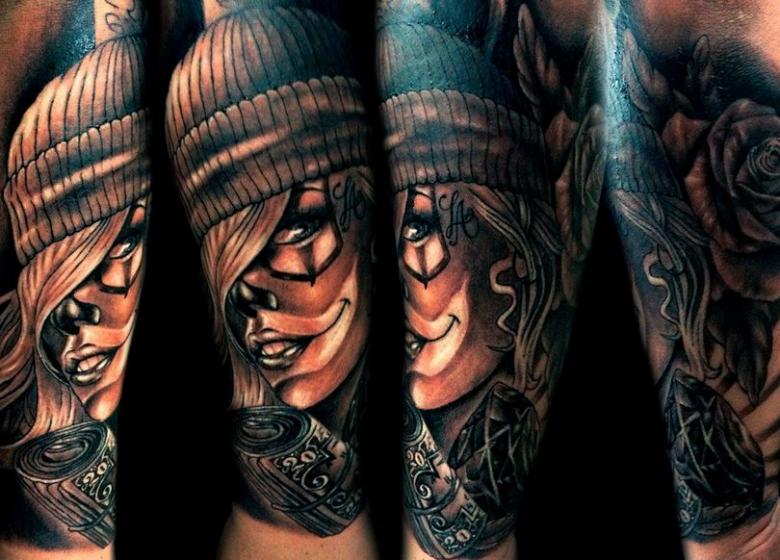 Стиль чикано, тату-эскизы привлекает леди их же портретами. Если мужчины наносят женские образы, чтобы подчеркнуть тягу к ним, то девушки выбирают зарисовки, чтобы передать свое эмоциональное состояние.