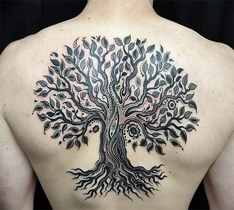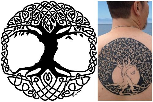 Тату Древо Жизни. Дерево — символ жизненной энергии у многих народов, кельты не стали исключением. Также в мифологии дерево часто выступает в качестве основы мироздания как связующее звено между небом и землей. Дерево в круге, выполненном в виде кельтской вязи — довольно популярный сюжет татуировки.