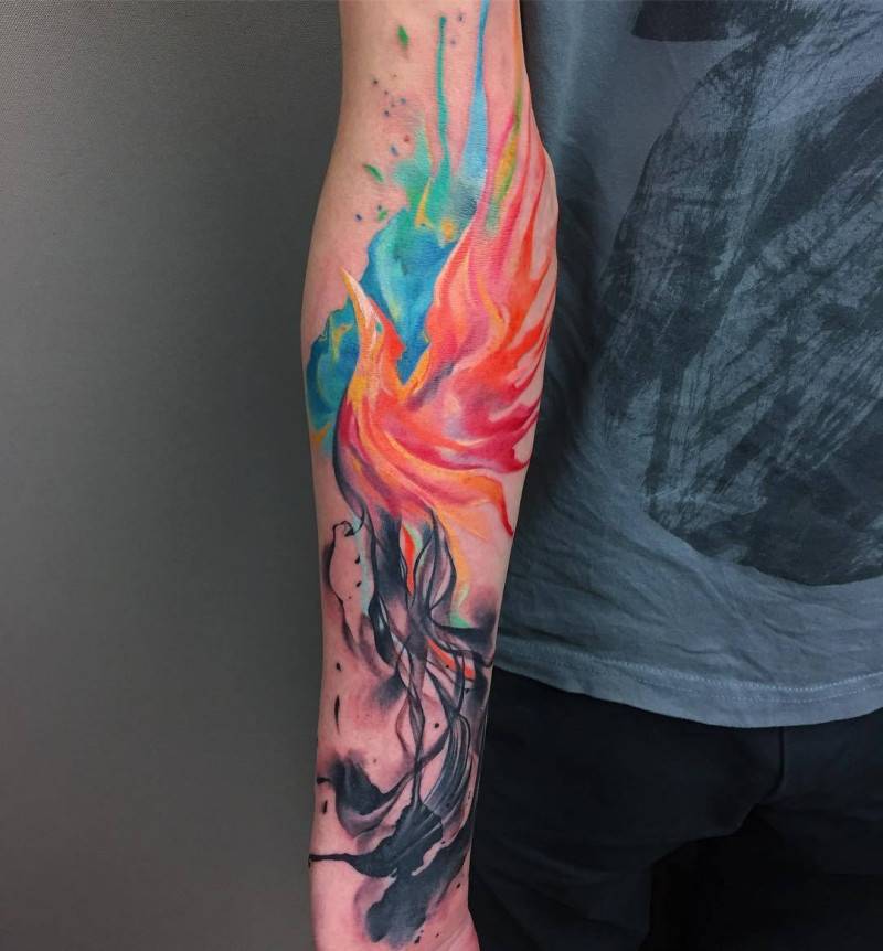Самое универсальное и распространенное решение — изображение феникса на руке. Такую татуировку выбирают те, кто желает показать окружающим свое отношение к жизни и всю красоту выполненного рисунка. Феникс, изображенный на запястье — очень распространенное тату. Такая татуировка обычно встречается небольшого размера. Многие выбирают картинку, когда некоторые ее части, например, хвост или крылья птица, переходят на другие участки руки. Очень красиво и ярко выглядит татуировка на предплечье. Здесь картина получится не такая большая, как на спине, но за счет определенной техники получается оригинальной и объемной.