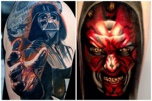 Научная фантастика в какой-то степени тоже относится к жанру фэнтези, а поклонников жанра ничуть не меньше, чем среди любителей крылатых коней и магии. Звёздные войны, Зомби, Другой Мир – лишь немногие темы, которые можно увидеть среди татуировок молодых людей. Самая распространенная тема – это, конечно, тема Звёздных Войн и миров, которые принадлежат этой серии фильмов: джедаи со светящимися мечами, принцесса Лея и, конечно, голова Дарта Вейдера – лишь то немногое, чем украшают свои тела фанаты.