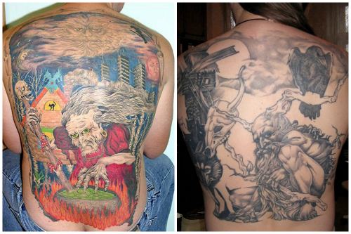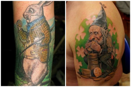 Очень популярны композиции из сказок и фольклорных произведений разных народов мира. Ведь в каждой культуре есть свои представители, которые являются главными героями легенд и историй. Тролли сразу же ассоциируются со скандинавской мифологией. Баба-Яга и леший – истинно русские персонажи. Многими из них нас пугали в детстве, поэтому при виде таких рисунков, мы бессознательно вспоминаем эти моменты. Fantasy tattoo с изображениями славянской нечисти часто встречаются на телах язычников.