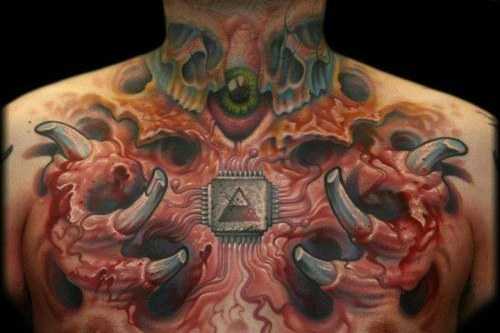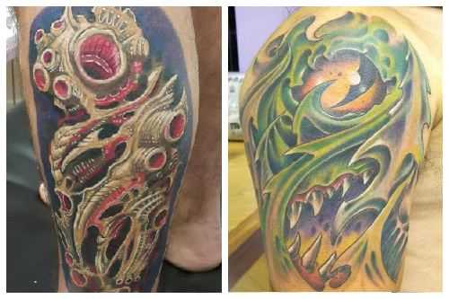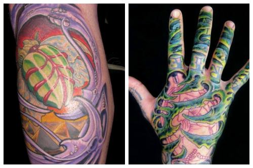 Можно и произвести некое объединение тату в стиле органика с биомеханическими наколками. Этот вариант позволит создать уникальный эскиз, который будет сочетать в себе мрачные оттенки и кислотные колоритные тона. Это станет отличным проявлением индивидуальности конкретного человека.