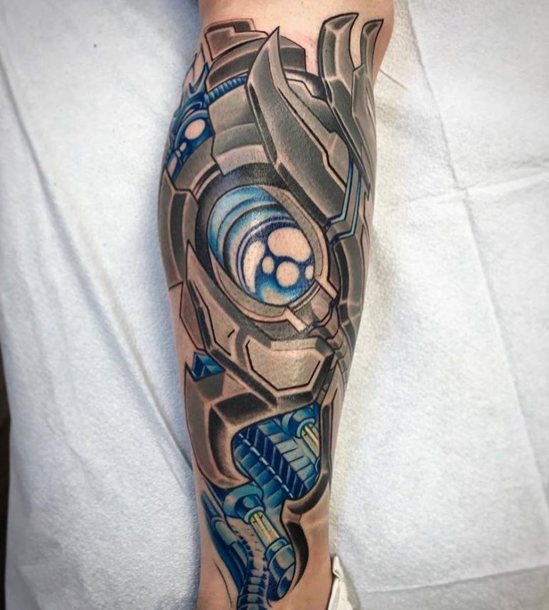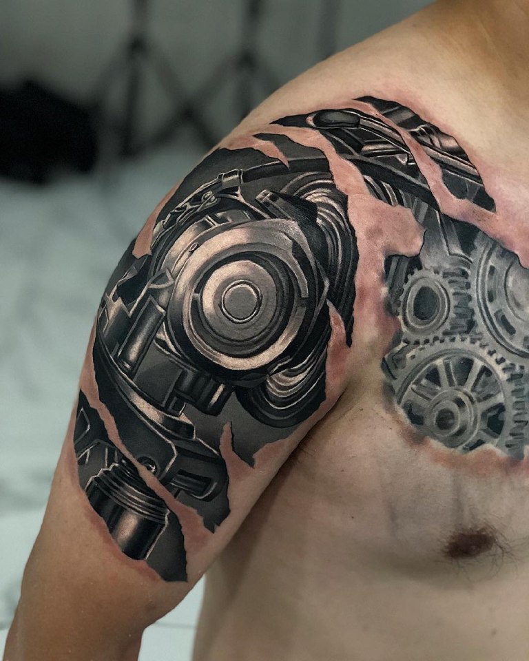 Также тату кибермеханика может размещаться на плече. Наиболее удачно рисунок будет выглядеть в том случае, если плечо накачано. Рельеф мышц придаст тату еще более объемный вид.