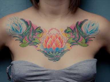 Тату на груди у девушек набивается крайне редко, поскольку эта область является очень чувствительной: нанесение рисунка может вызвать сильные болевые ощущения.