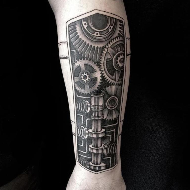 Тату Биомеханика — это сравнительно молодой стиль, который стал популярен в конце 20 века. Татуировки в стиле биомеханика изображают на теле человека механизмы, которые вырываются из-под кожи. Шестеренки, поршни, сложные стальные механизмы — основные сюжеты тату биомеханика. Мода на подобные рисунки развивалась вместе с техническим прогрессом.