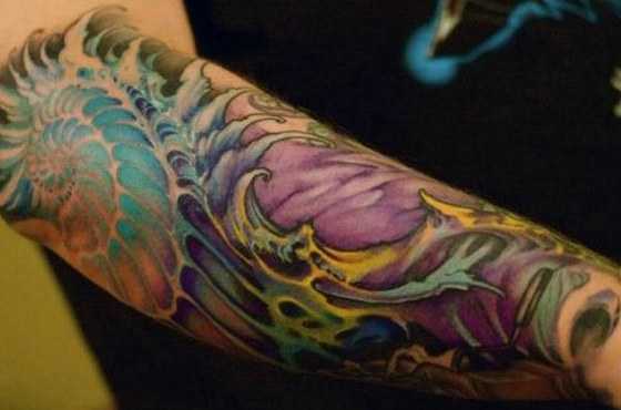 В этом стиле татуировки рисунок словно не на коже, а из под кижи, он выглядывает из глубины тела, показывая самое нутро и подноготную. Обычно он выполнен мягкими и плавными линиями в ярких, почти кислотных цветах. Тату в стиле органика позволяет как угодно экспериментировать с колористикой и композицией: сюжет не несет какой-то смысловой нагрузки, рисунок чаще всего абстрактный и является просто украшением тела.