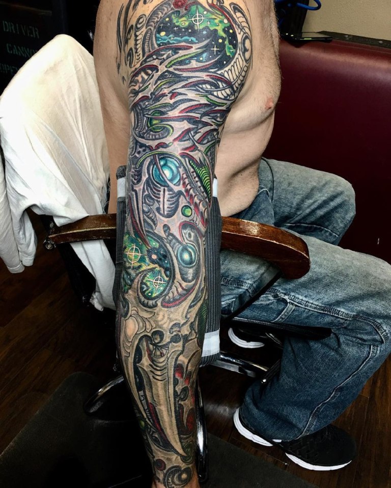 Механика, нанесенная на руке, в виде рукава, является самым популярным дизайном мужских татуировок. При таком исполнении, механизмы, виднеющиеся сквозь повреждения и разрывы кожи, напоминают части робота, подобные Терминатору. В основном, рукава набивают люди, независимые от мнения окружающих людей, имеющие волевой характер.