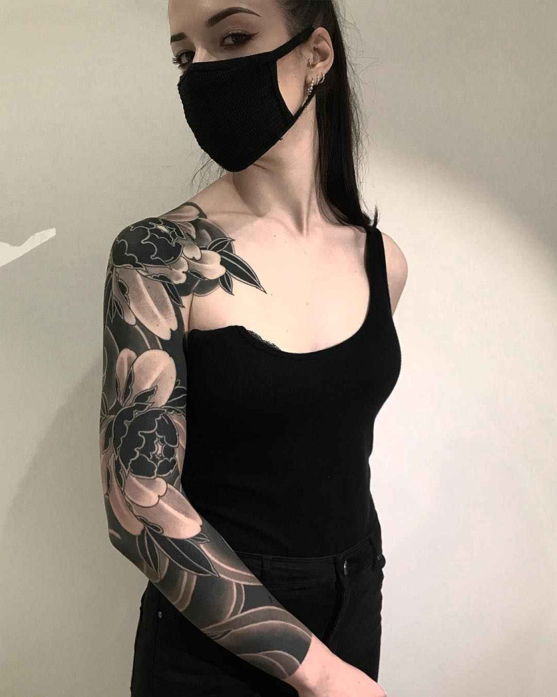 Татуировка рукав характерна для японской нательной гравюры. Эскиз наносится от плеча до самой кисти. При этом кожа заливается красителем без оставления пустот с четкой прорисовкой контуров.