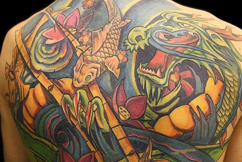 Приветствуется игра красками. Ограничений практически нет, поэтому рисунки отличаются яркостью и колоритностью. Красочные переходы могут быть как резкими, так и плавными. Тона меняются неожиданно, но гармония изображения при этом не теряется. Отлично будет смотреться дракон, выполненный в красном или золотом цвете, который сочетается с голубой водой и белыми лотосами, плавающими в ней. Реже этот мифический зверь выполняется в зеленом или фиолетовом цвете.