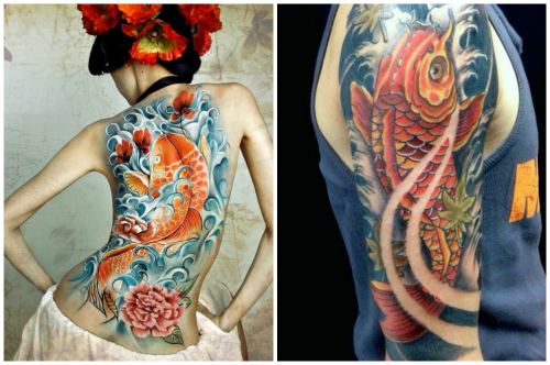 - Карп Кои – не просто красивая рыбка, а символ стремления к цели и движения только вперед. Такая татуировка в основном украшает тела мужчин, показывая темперамент воина и олицетворяющая смелость, упорство и мужество. Наносится с использованием ярких золотистых оттенков, часто объединяющихся с голубым цветом, символизирующим воду;
